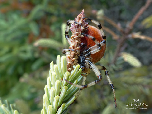 Pudgy little yellow shamrock orb weaver scurrying along the rocky trail.